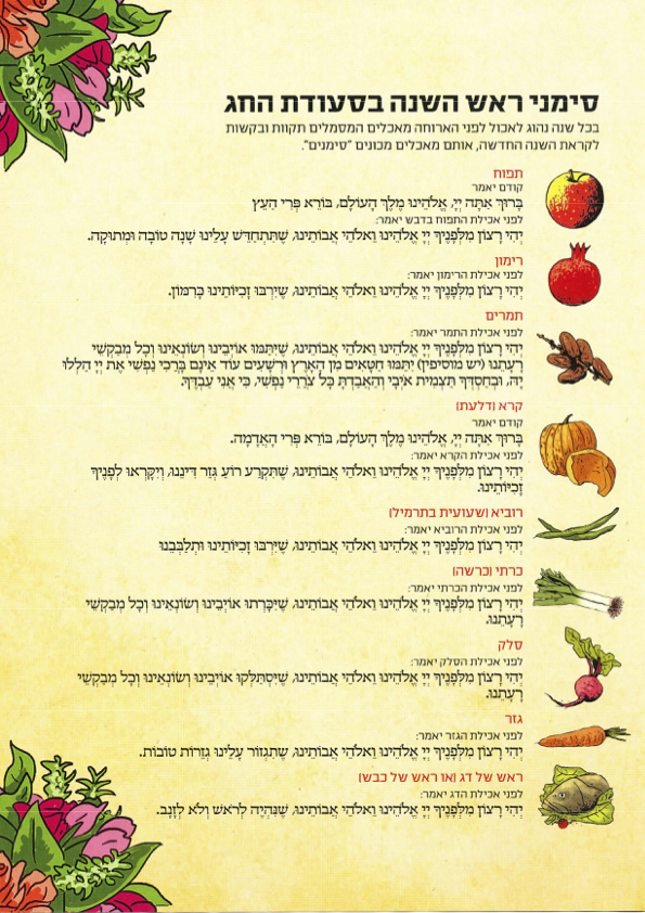 Beim Rosch Haschana Seder verzehrt man vor der Hauptmahlzeit symbolische Speisen, die unsere Hoffnungen und Wünsche für das neue Jahr ausdrücken. Diese Speisen werden „Simanim“ (Zeichen) genannt.